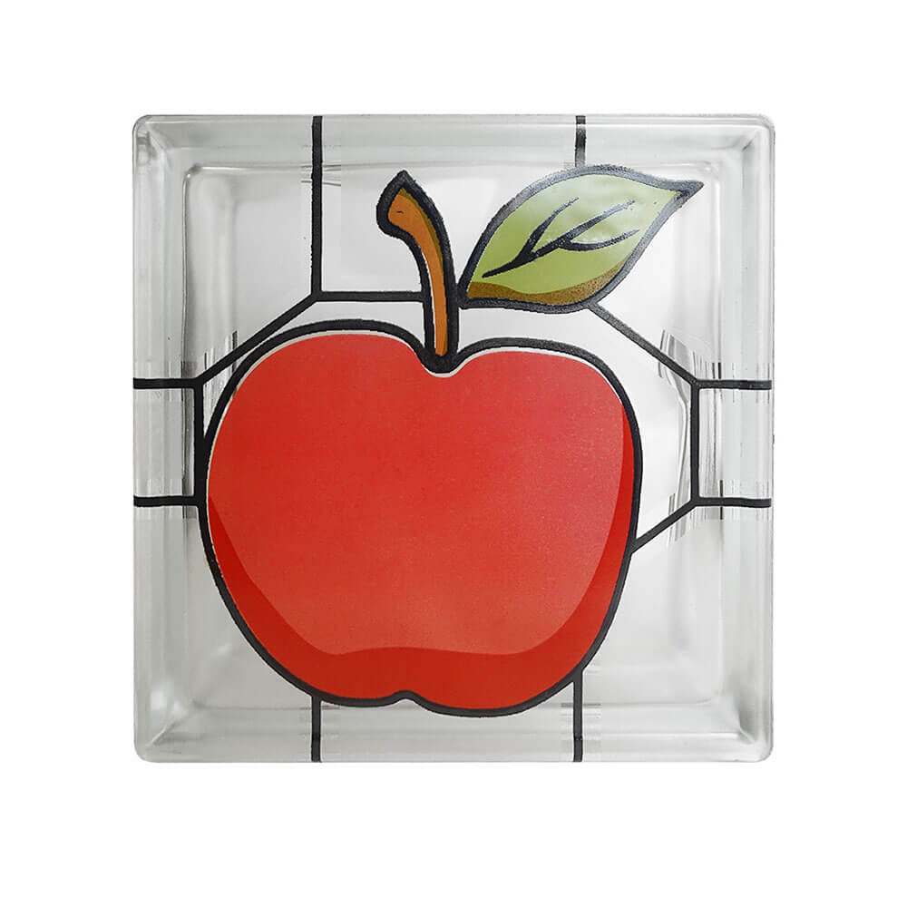 Vidrio block decorado manzana Index Internacional que permite la entrada de luz natural a cualquier espacio interior o exterior como ventanas, muros, losa, piso, etc. Sus medidas son 19 x 19 x 8 cm.